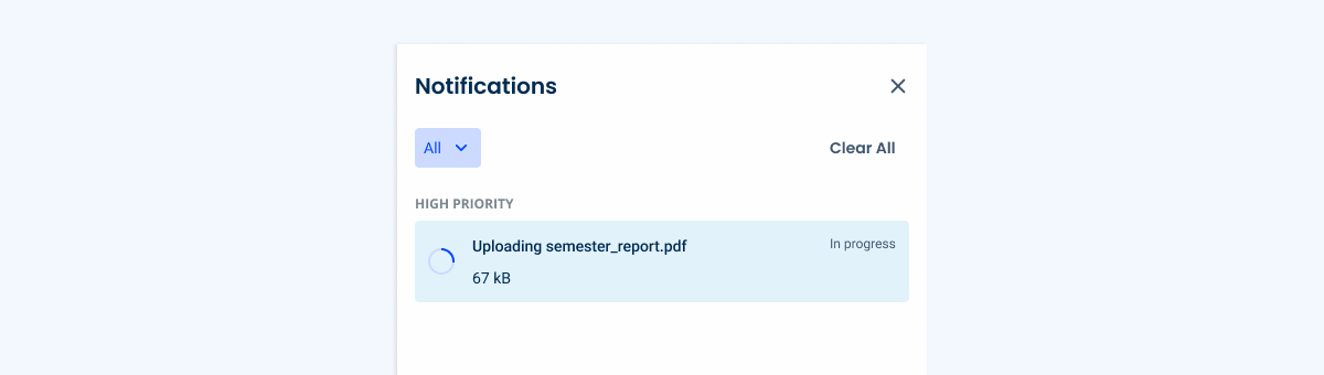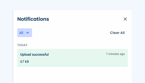 Components such as Toasts can provide immediate feedback when a task starts, while the Notification Panel offers a more persistent way for users to monitor activity. Communicating the result – whether success, a warning, or an error – ensures that users stay informed and can take action if necessary.
