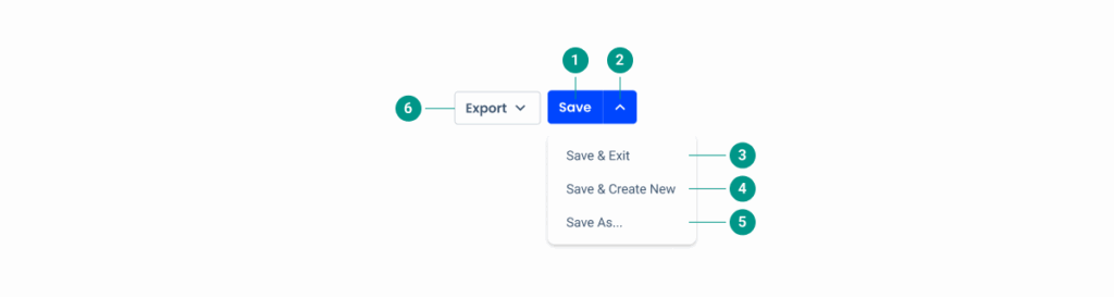 | 1 | Primary Button | Save, has more options, primary button [if applicable]. |