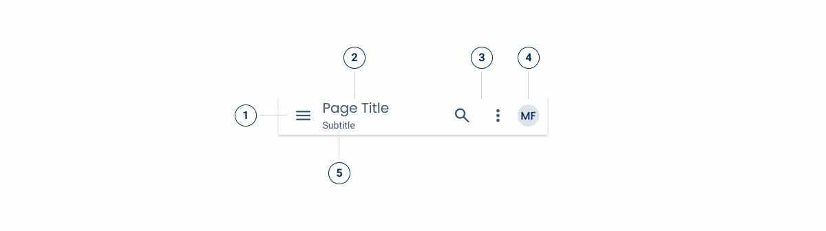 Similar to the Desktop Page Title and Top Bar components, the Top App Bar is an element placed at the top of an interface, providing users information about the page they are currently on, as well as navigation buttons and other relevant actions.