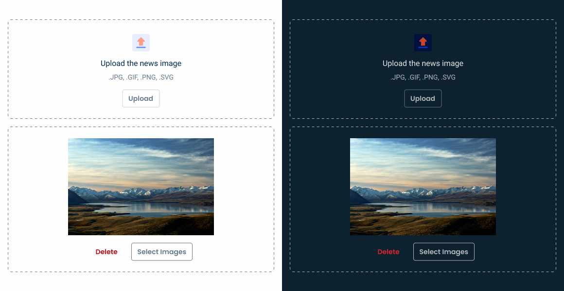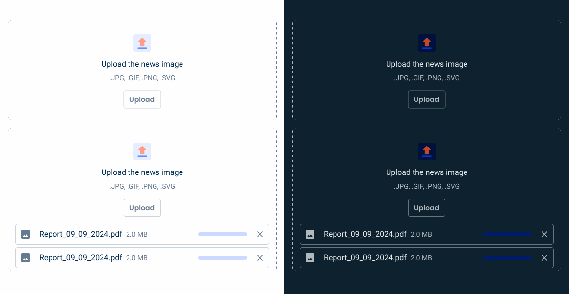 In the Image Uploader pattern, the empty state is displayed by default in both the enabled and hover states in the drop-zone. This decision ensures a consistent visual language across components, reducing the need for additional states or transitions that might overcomplicate the user experience.