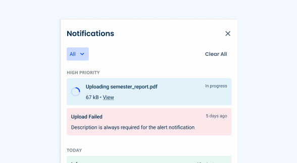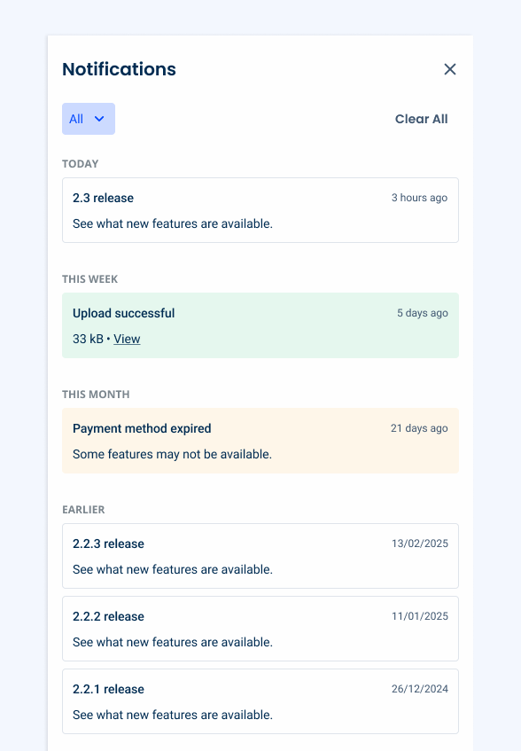 Unlike pop-up notifications or alerts that interrupt the user’s workflow, Notification Panels offer a more subtle way to keep users informed. Users can check their notifications at their convenience.