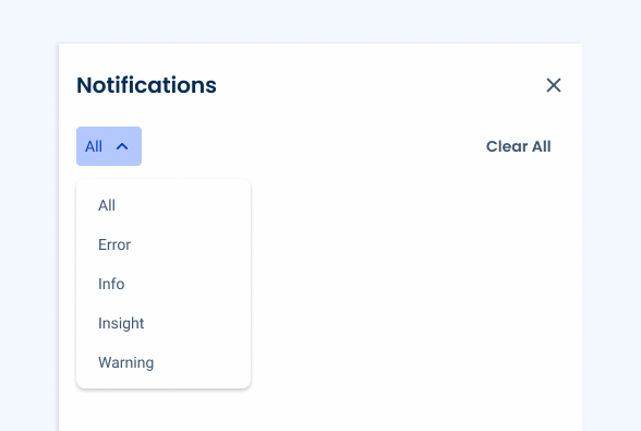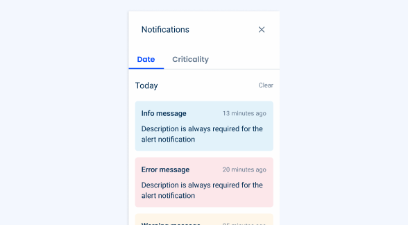 This panel is a notification center that displays system-generated messages to users. To access it, simply click on the Notifications button in the Header.