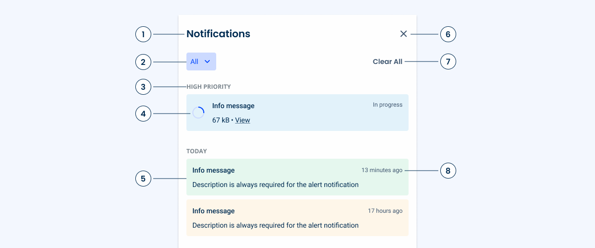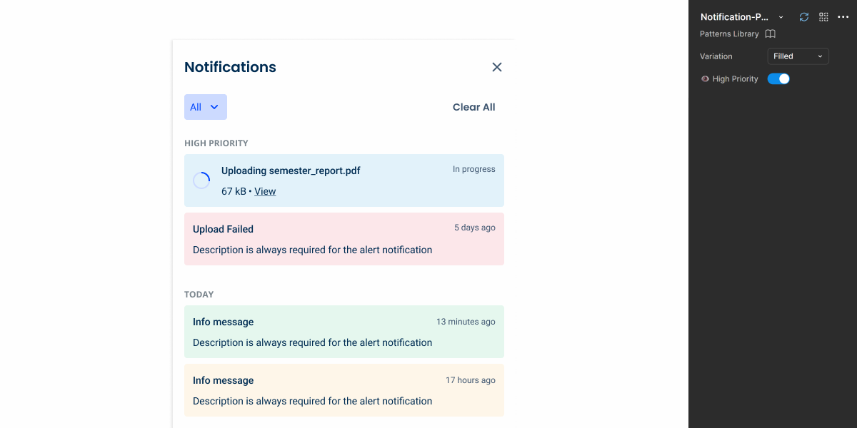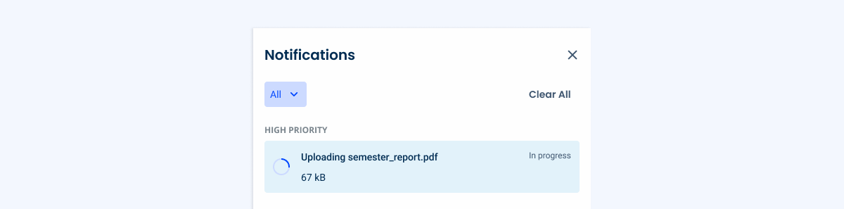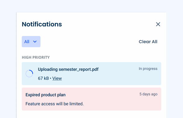 To address this, a “High Priority” group can be used, which always remains at the top of the Notification Panel. Only notifications with a significant impact on the user experience should appear here. Some examples include: